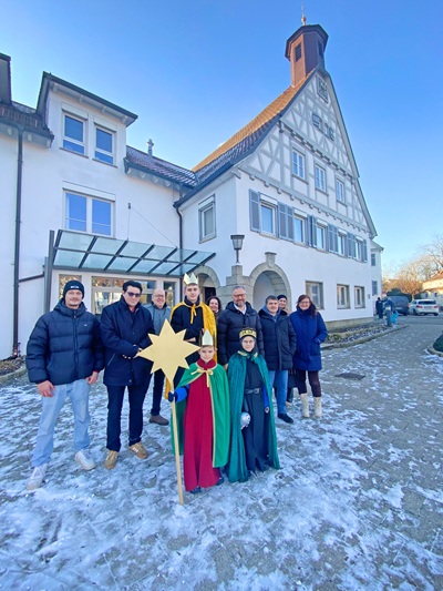 „Gott segne euch im neuen Jahr,das wünscht euch die 3-Königs-Schar“,sagt der 8 Jahre Elias,der mit seinem Bruder Felix (6 Jahre) und dem 15-jährigen Markus Hagenlocher als Sternsinger verkleidet vor dem Uhinger Rathaus steht. In Begleitung von Patrick Pertl von der katholischen Kirchengemeinde Uhingen ziehen die Segensbringer bei strahlendem Sonnenschein und klirrender Kälte von Haus zu Haus.
