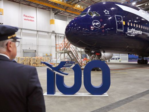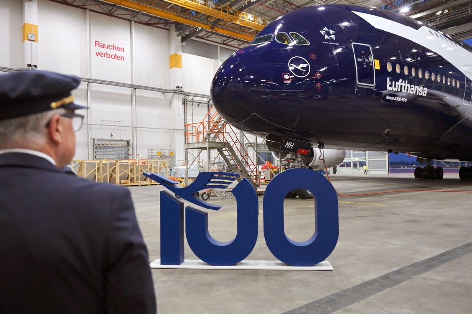 Airbus A380 der Lufthansa mit Jubiläumslackierung steht in der Wartungshalle des Münchner Flughafens: Kaum ein passenderer Ort